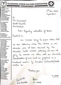 ‘We Telangana Junior Doctors Association bring to your notice that we are continue the strike as our demands were not assured by the Health Minister yesterday. we are not going to resume our duties until our demands (Decentralisation of Covid cases) are fulfilled in a time bound manner,” the letter said.